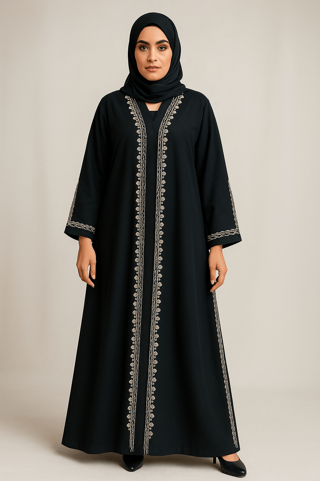 Elegant and understated, this black abaya is embellished with detailed embroidery, perfect for both formal and casual wear. Disclaimer – The images provided are AI generated and are 85% of the look of the original, if you need more information/pictures about the product, please reach out to us.