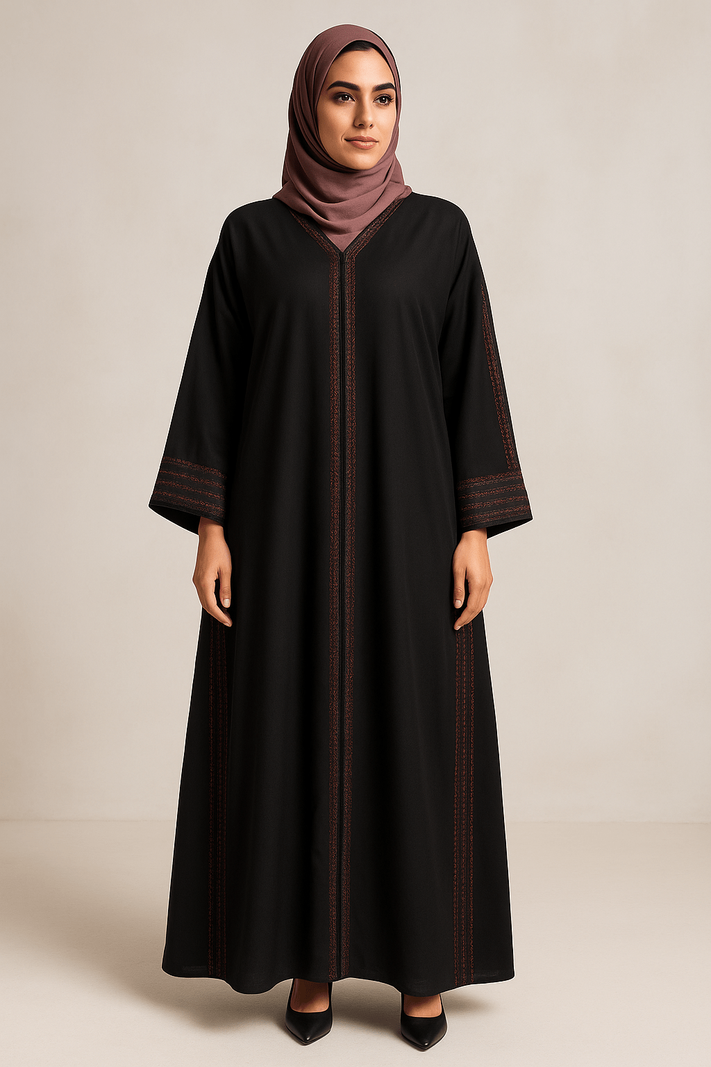 An exquisite black abaya adorned with intricate embroidery and eye-catching stonework, perfect for elevating your style. Disclaimer – The images provided are AI generated and are 85% of the look of the original, if you need more information/pictures about the product, please reach out to us.
