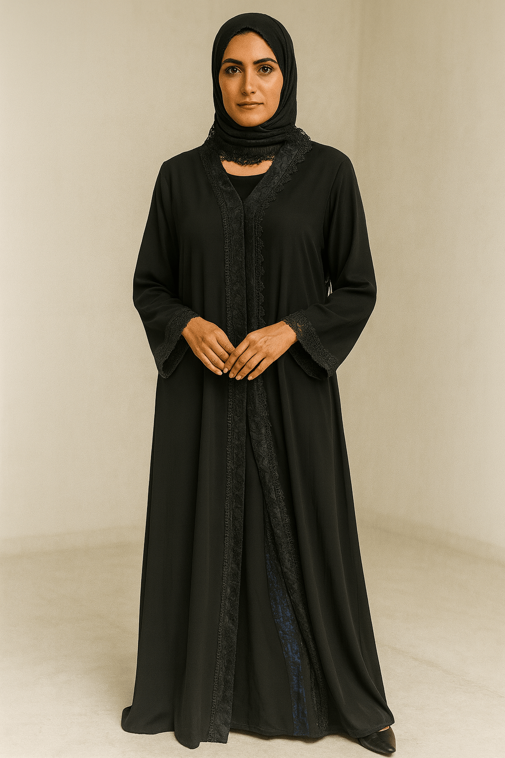 Combining delicate lacework with shimmering stone embellishments, this black abaya brings a luxurious touch to any wardrobe. Disclaimer – The images provided are AI generated and are 85% of the look of the original, if you need more information/pictures about the product, please reach out to us.