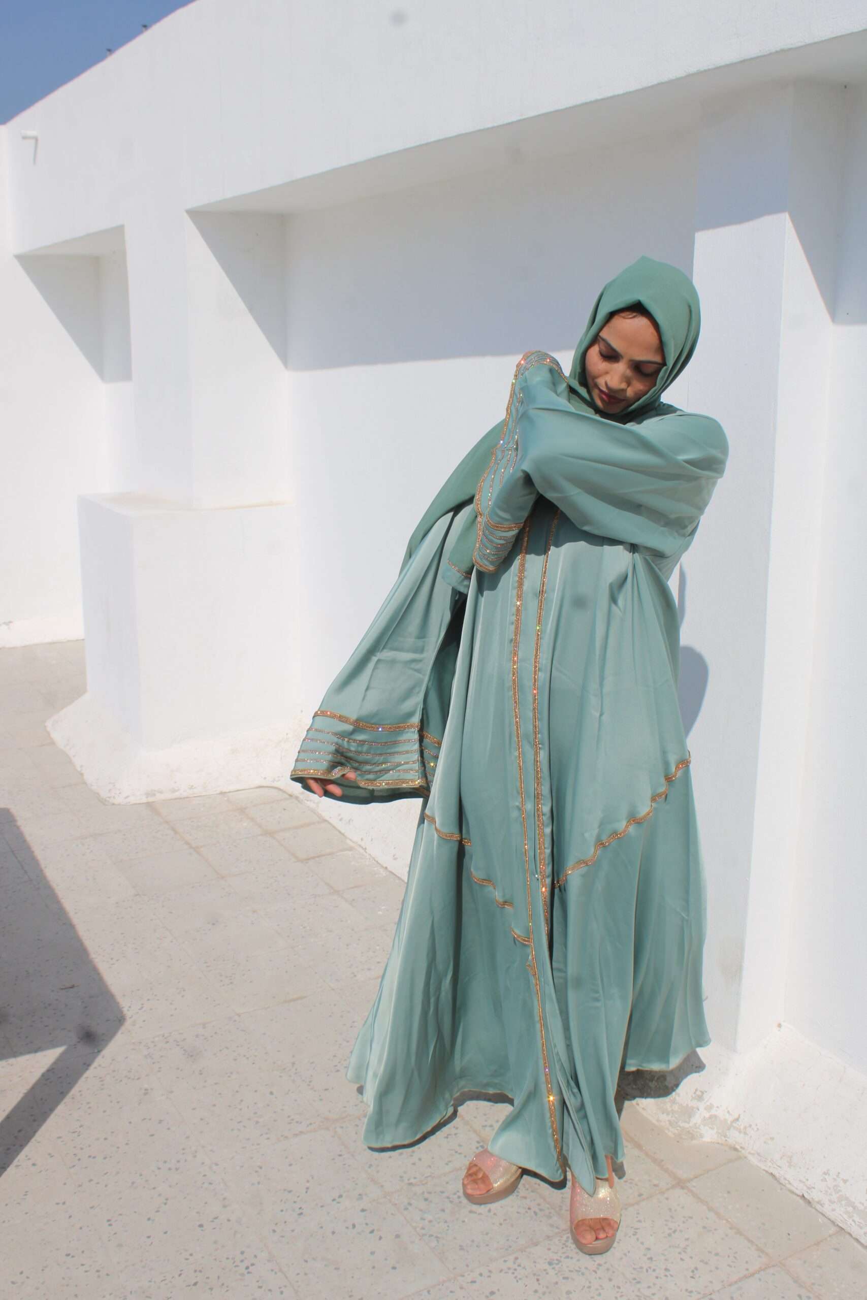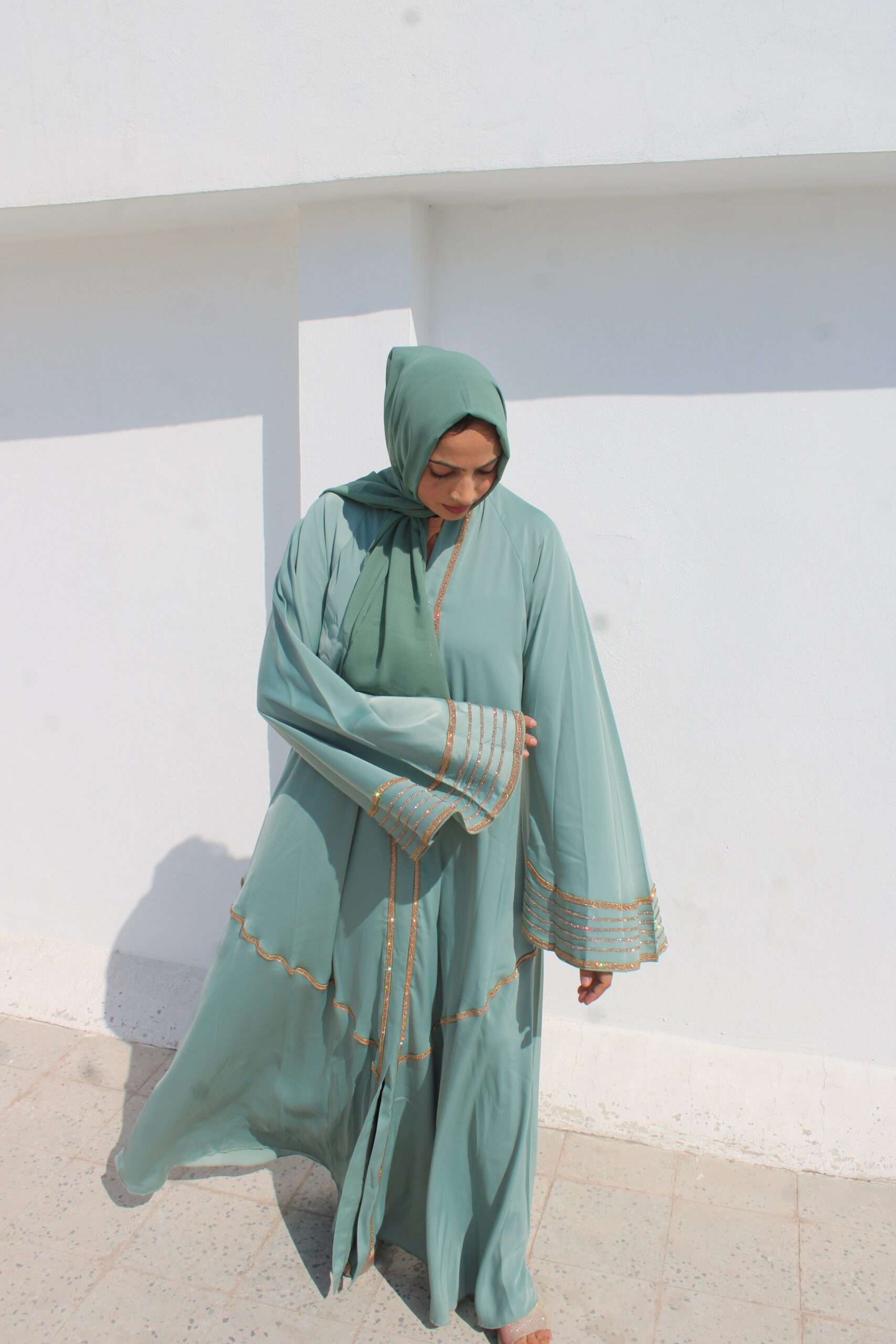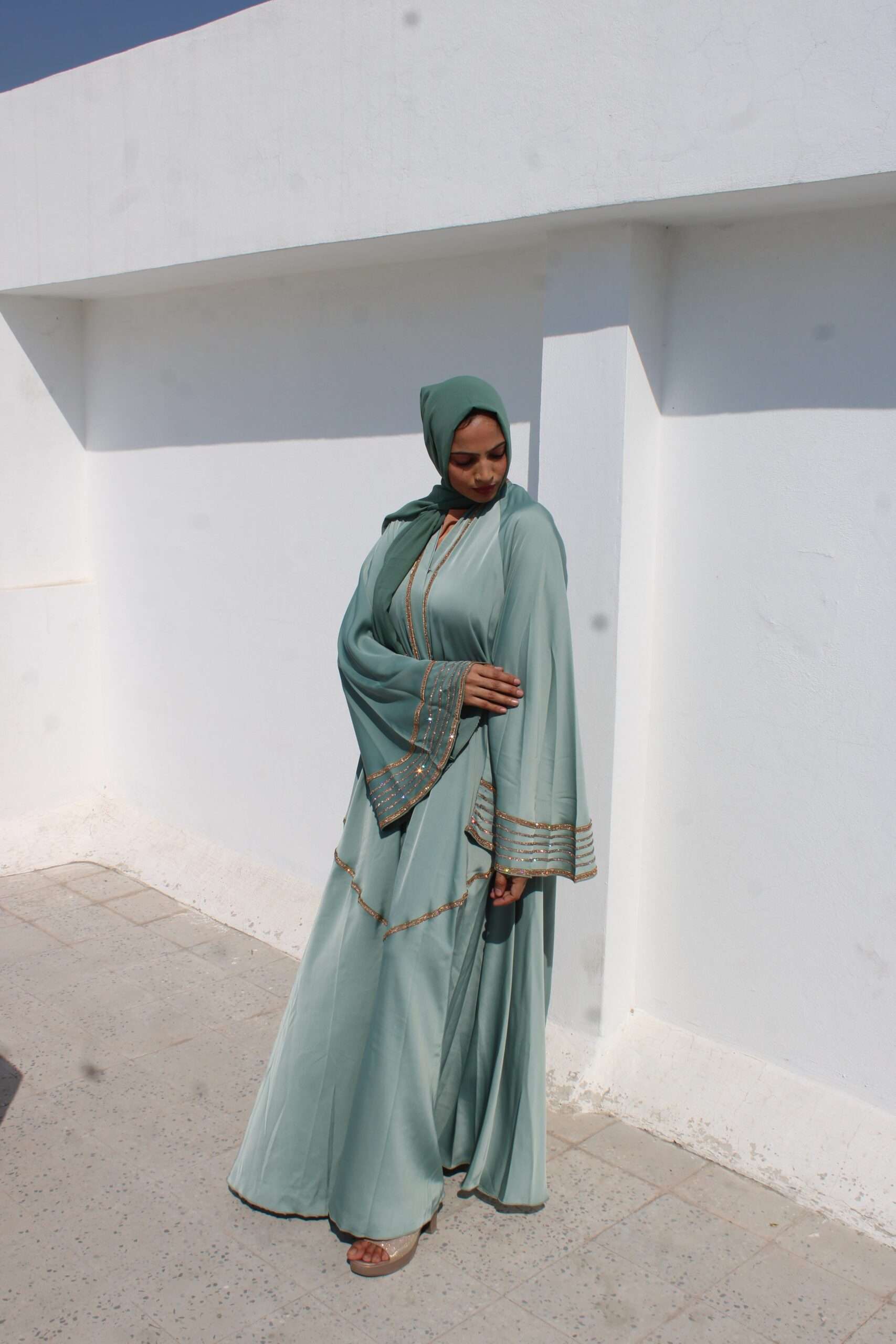 Grace meets elegance in this stunning Green Abaya, adorned with delicate lace and shimmering stone work. The rich green hue adds a regal touch, making it perfect for both formal and festive occasions. Intricate lace detailing along the neckline and sleeves enhances its refined charm. Sparkling stone embellishments catch the light beautifully, adding a touch of glamour. The soft, flowy fabric ensures comfort and a flattering fit. A matching hijab with subtle lace accents completes the look. Step into any event with confidence and grace!